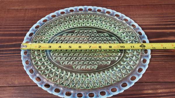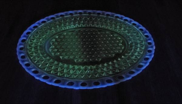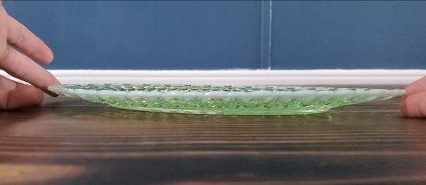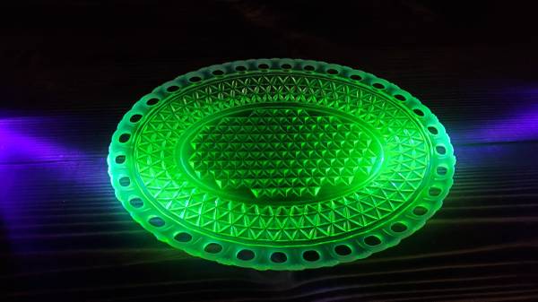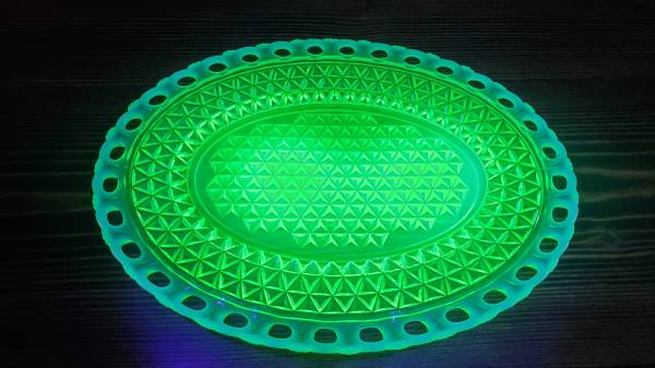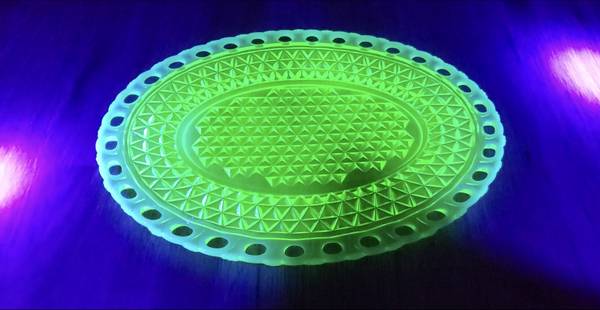 VERY bright under 395 uv light. No chips or cracks, but this 13" platter was made slightly uneven, as seen in the pictures. The lip is about 1/4 inch higher on one side than the other, which is...