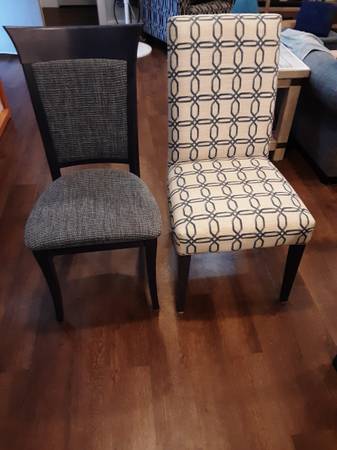 Custom Lazyboy dining table -- $600 or BO -- 68 1/2"L x 42" W x 31"H (leaf 20" x 42") 5 regular chairs in blue with 2 captain chairs in coordinating blue pattern. Base of table is blue with wood top, table is a hardwood. Table can seat 8. Pick-up, No Deliveries.