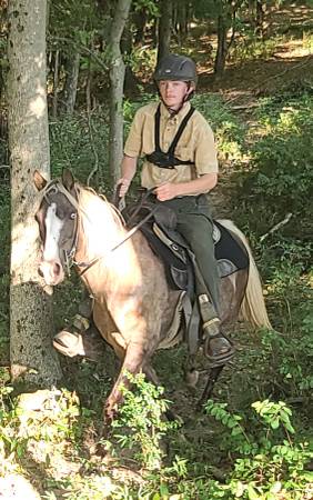 She is up to date on vaccinations, coggins, worming, dental and trims. She stands tied to a trailer, rack or overhead. She loads and rides well in trailer. Gets along with geldings or mares.