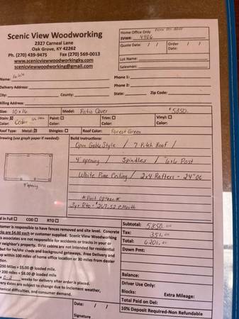 10 x 16 Pavillion Ready For A New Home!! Open gable style, 7 pitch roof, 4" opening, spindles, 6 x 6 posts, white pine ceiling, 2 x 4 rafters, and more!! Price $ 5,850.00 5850 Edmonton Rd. Glasgow,...