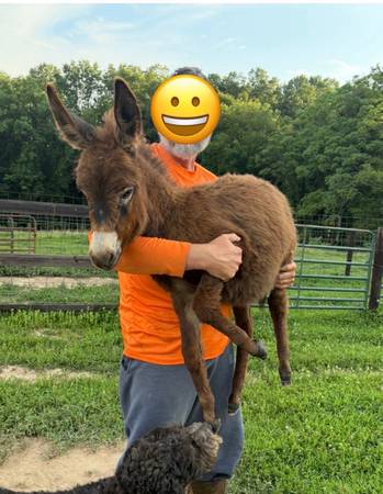 Friendly male baby miniature donkey handled daily. Born 4/19/25. Pics of parents available upon request. Updated pics added