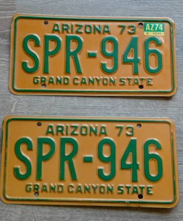 2 sets of vintage 1973 License plates. One set from Michigan and one set from Arizona. $25.00 each set. Will not separate.