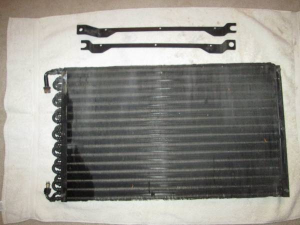 Photo 5 : Condenser (part that goes in front of the radiator), in excellent used condition. Will guarantee it to be good. I think it fits 1973-1982 Corvettes : $85.00 : NOTE- the black shown in the photo is my shadow NOT an oil leak