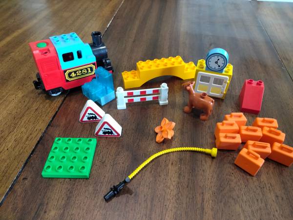 Large lot of duplo train pieces. Includes the following: 1 working locomotive 7 RR car chassis 1 fuel hose 20 Straight tracks 40 curved tracks 2 switch tracks 2 RR crossings and gate Suitcases,...